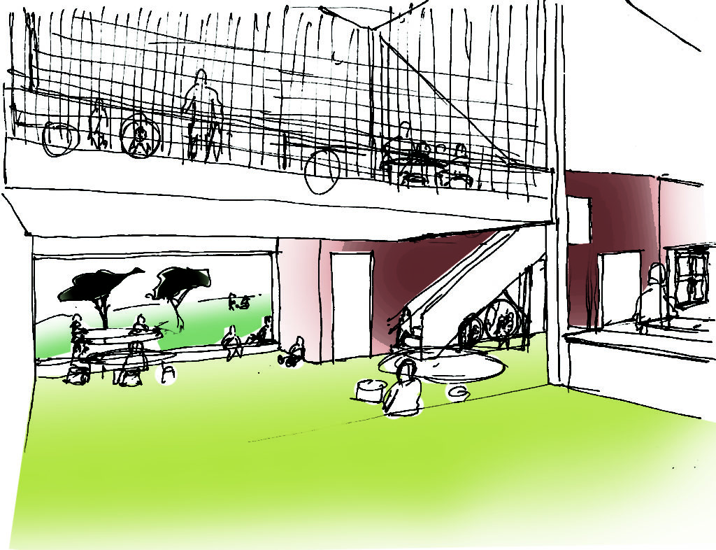 Perforerede stålplader blev indtænkt i ombygningen med henblik på at skabe en attraktiv og behagelig akustik. Perforeringerne danner bl.a. billede af Gåsetårnet og omgivende historiske lokaliteter.
