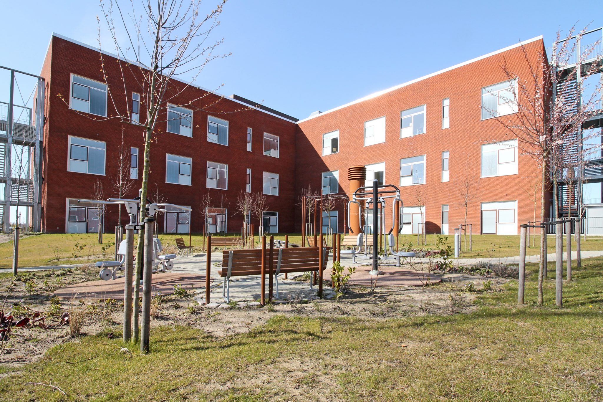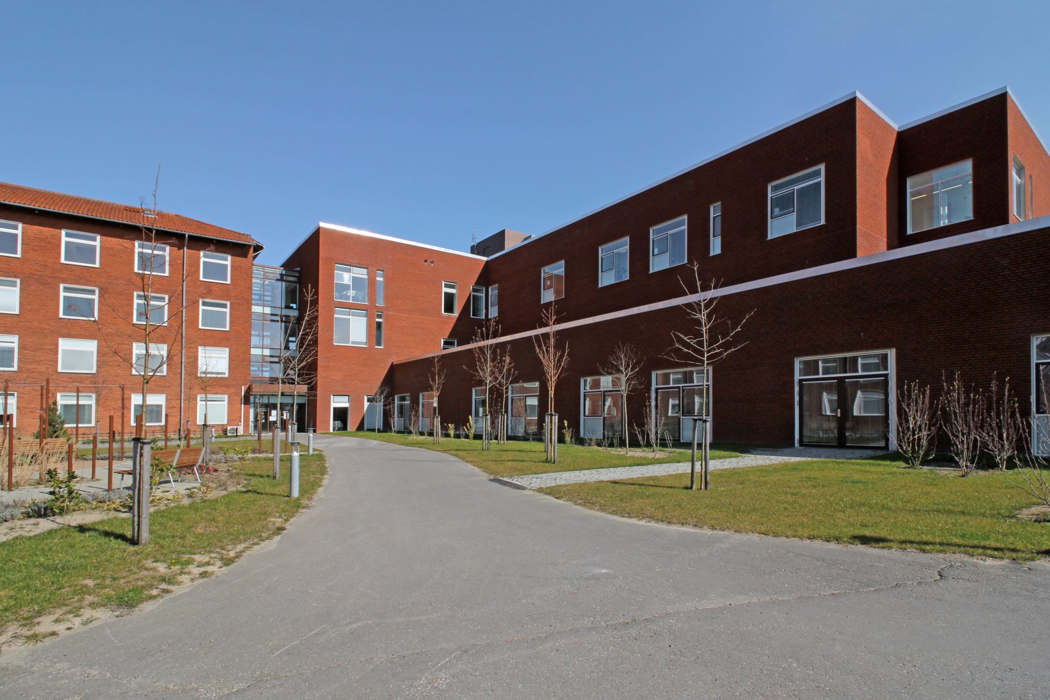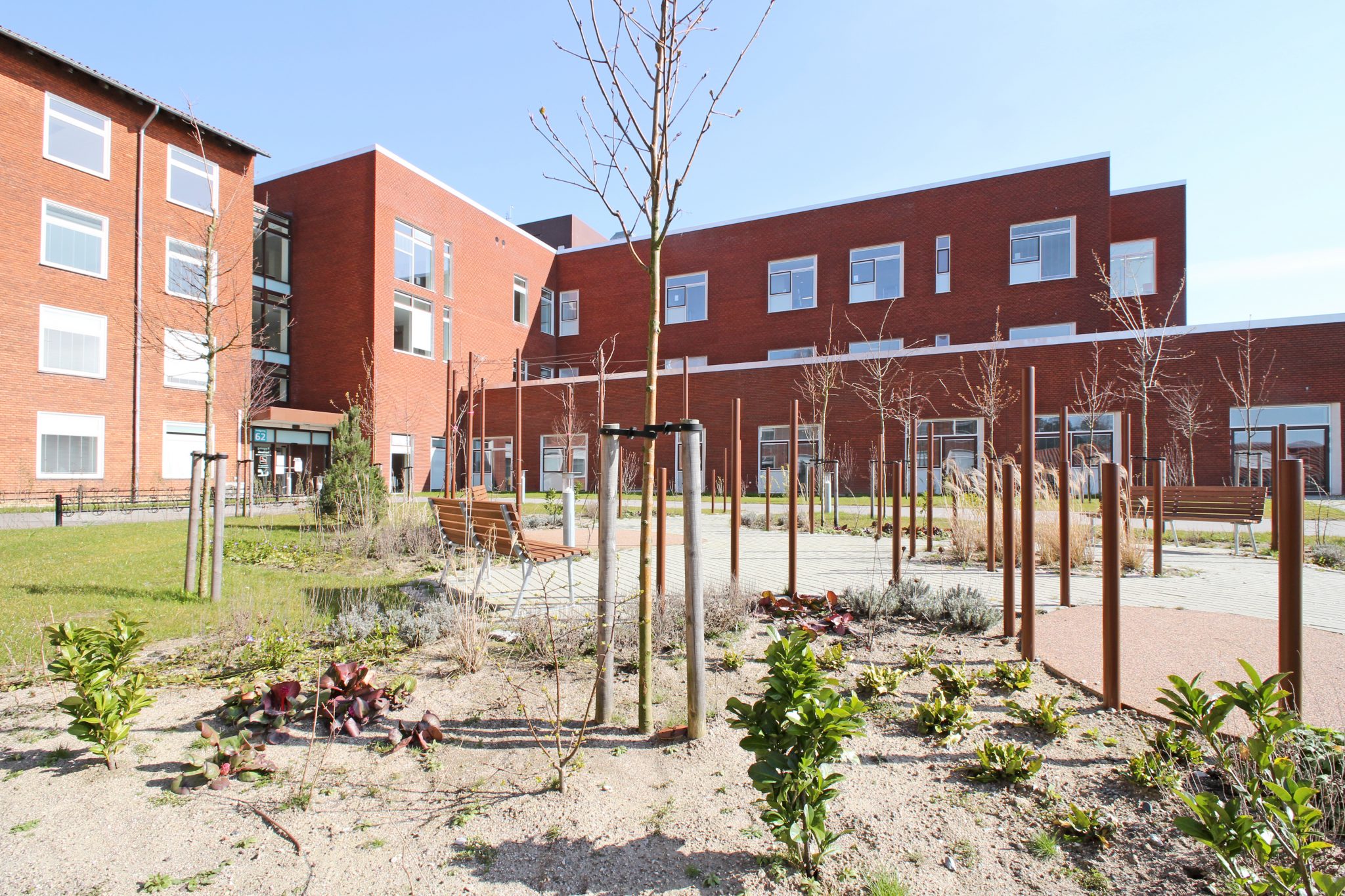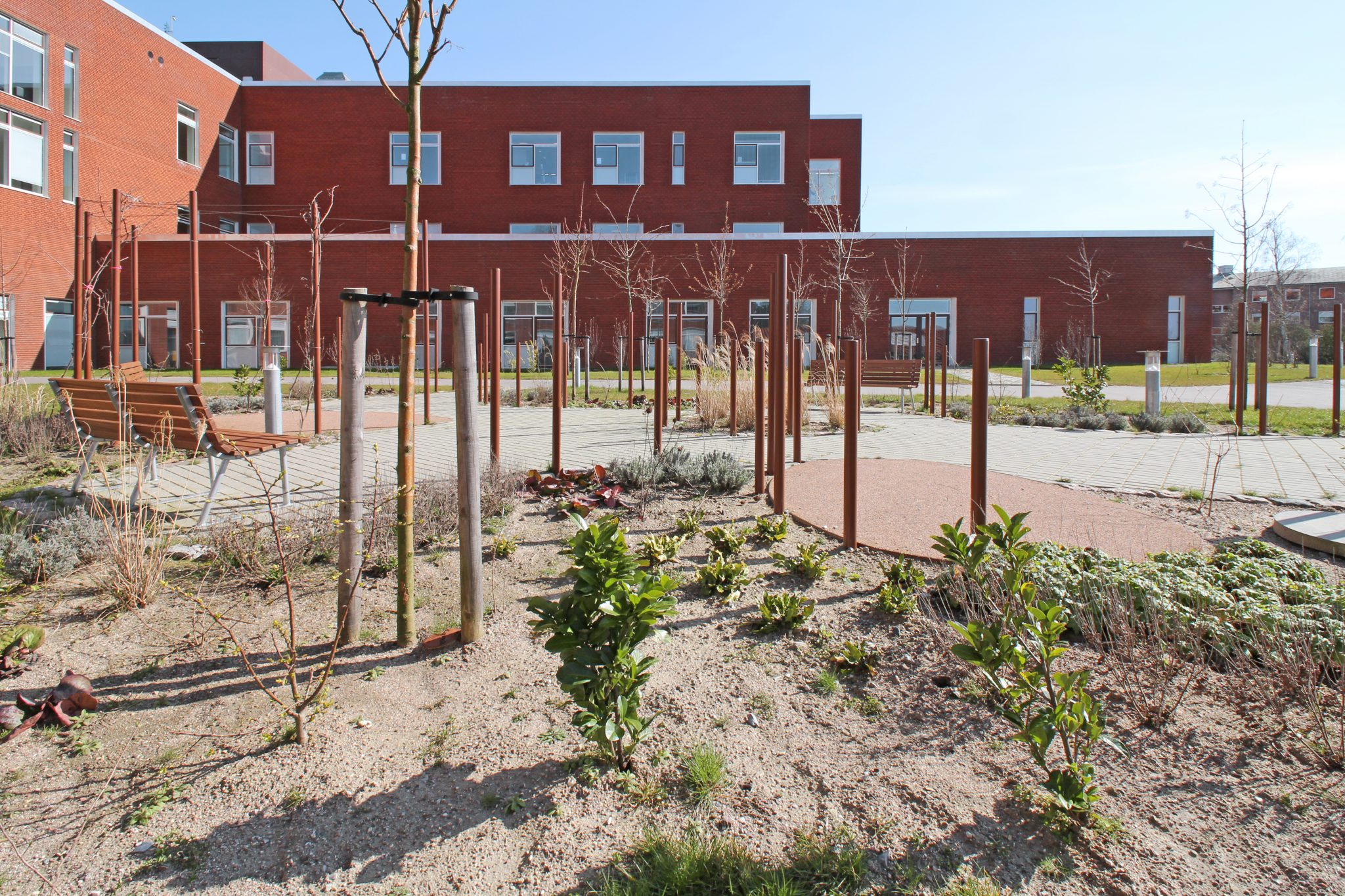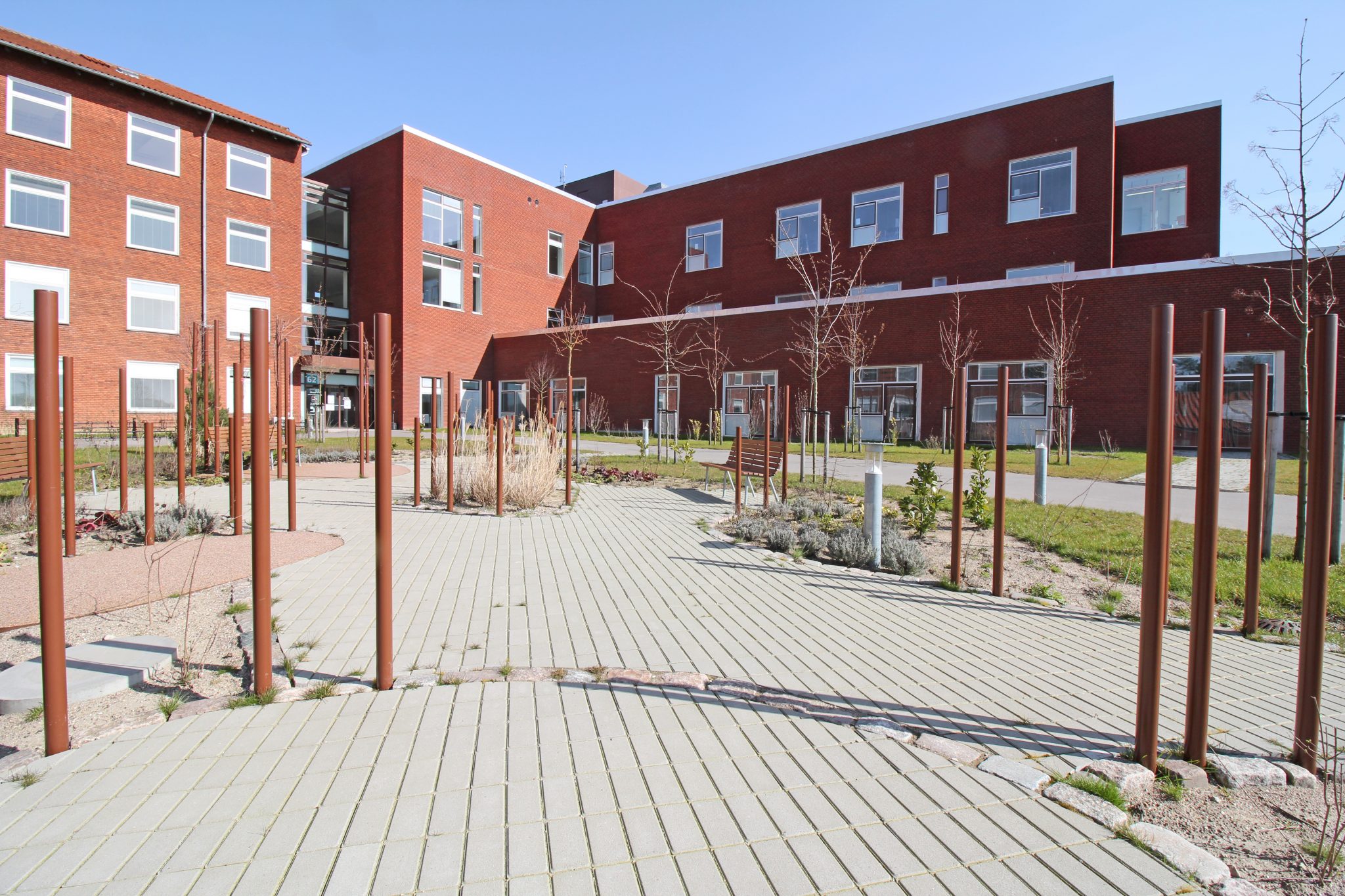 Forpladsens organiske udtryk står i kontrast til hospitalets statiske volumener og introducerer et mere flydende formsprog. Dette opnås gennem en dynamisk landskabelig bearbejdning samt en skulpturel placering af cortenstålpinde, der tilfører stedet en særlig visuel og rumlig identitet.